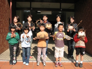 自分たちで拾った小枝やどんぐりを利用して工作が始まった。リースを作ったり、どんぐりに顔を書いたり思い思いの作品が出来た。指導員のポケットから特別の「真っ黒クロベイ」が出てきた。