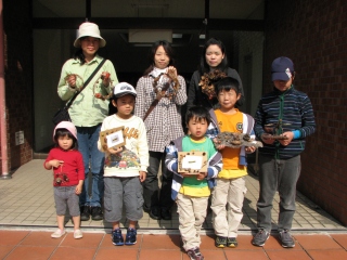 雲ひとつ無い晴天、風も無く観察日和、9時半公園管理棟の集合。挨拶後、工作の見本を見て“かわいい”の歓声が上がった。観察をしながら芝生広場に向かい工作に使う、どんぐり、赤や黄色の落ち葉、枯れ枝をひろったこの秋の台風18号の影響で公園の木の枝が折れているものがありました。公園の中の風の通り道の紅葉はとても色鮮やかに赤や黄色に輝いていました。