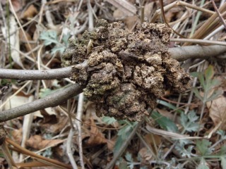 【右】フジの幹に付いた植物の癌です。癌腫病といわれています。