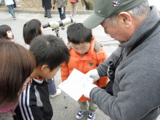 【左】最後にどんな鳥が見られたか振り返りをしました。野鳥の会では「鳥合せ」といいます。
