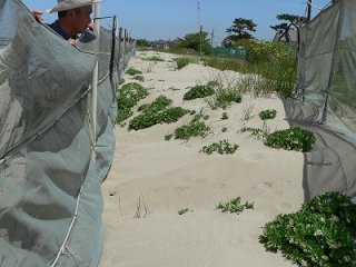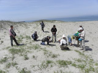 【左】COP10のPR用に使われる写真撮影が行われました。 【右】海浜植物の生育状態を観察