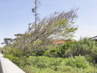【左】西風で曲がったエノキ(風衝樹形といいます)