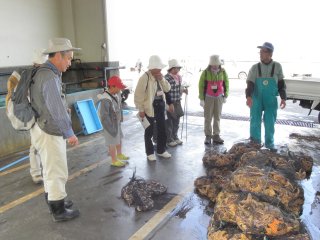 【左】蒲池港で本日の予定、確認 【右】漁師の人がアサリに害を与えるヒトデとツメタガイを駆除して水揚げしました。