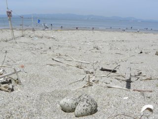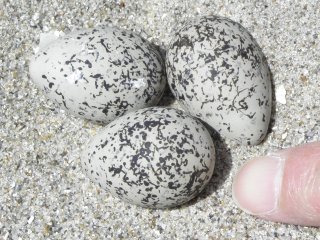 【左】砂浜の色に溶け込んだシロチドリの卵