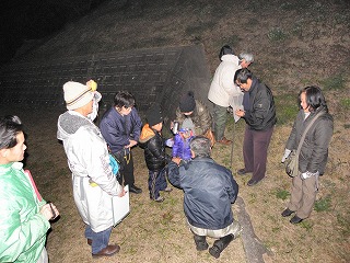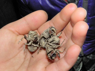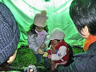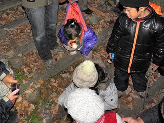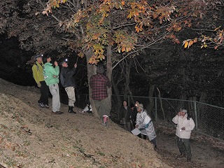 師走に入り、少しずつ寒さが増してきましが、天気は下り坂となり寒さがゆるいだ代わりに曇天で星空観察はできませんでした。それでも4家族、9名の参加者がありました。冬は生き物の活動が一般に少なくなります。それでも冬の季節を利用して子孫を残そうという生き物も見られます。そんな生き物に出会うため水銀灯を点しそこにやってくる生き物を観察しました。また、懐中電灯を点けて公園内を生き物観察をして廻るナイトハイクを行いました。夏に比べ出合った生き物は少なかったですが楽しい観察が出来ました。(記・降幡)
