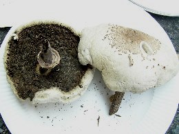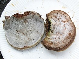 【左】人間の脳みそに似ているところからノウタケという名前が付きました。写真のものは老化したもので、埃のような胞子が出ます。