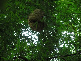 【右】モウソウチクの地上6メートルの所にコガタスズメバチの巣があり、ハチが出入りしていました。
