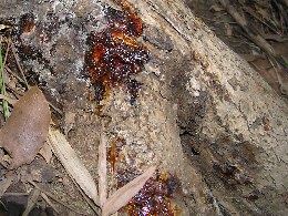 【右】カクレミノの樹皮から樹液が出ています。これに触るとかぶれる人があります。