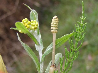 図賀奈池へ向かう。田んぼにはいろいろな野草=食材が並んでいる。子ども達も大喜びで野草を手にしている。只、気温が低いので、昆虫の活動が見られない。タンポポ、ツクシ、スギナ、カキドオシ、ホトケノザ(コオニタビラコ)、ハハコグザ、アリアケスミレ、セイタカワダチソウの新芽を摘んでいく。天ぷらの準備を進めていると、にわかに雨が降り出す。風もかなり強くなる。池の土手の奥に天ぷらをセットしてから、森の奥へ、春の使者「ショウジョウバカマ」の花を探しに入る。今年も10株くらいが生存していてほっとする。5株ほどが開花している。鈴鹿山系や長野県で見るものとちがい、背丈が高い。水のわき出すところにひっそりと寄り集まるようにして咲いていた。近くに「ユキノシタ」の株もあるので、食材にいただいていく。さらにリョウブの新芽もたくさん出ているので、これも食材に。さて、野草の天ぷら会の開始。シェフ山本の指揮の下、次々に揚げていくが、次々に皆さんの口に入っていく。変わりどころでは「ガマ」の新芽の元。癖のない味で歯ごたえがよい。ヤブツバキの花もほんのり甘くおいしかった。もったいないので、採集したものはほとん残らずいただいた。人気商品ナンバーワンは「タンポポの花」。次は「リョウブの新芽」。終了した時点で、春の嵐が運んできた黄砂も観察できた。(記・村瀬)