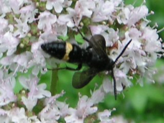 【右】キオビツチバチ(地中にいるコガネムシの幼虫に寄生するそうです。地面すれすれを飛び回っている理由がわかりました)
