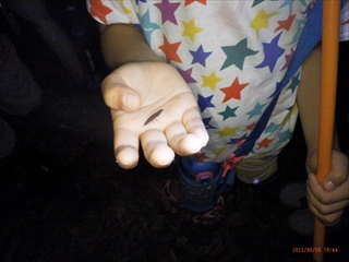 昨年は、ホタルの光を誰も感じなかったが、今回は「あっ、ひかった」という声が時々あがった。そういう声が上がり始めた頃、雨がポツリポツリと落ちてきたので、「電気つけて、ホタル探していいよ。」ということで、探したら、1匹見つかった。それを手のひらにのせ、皆に見てもらって、急いで、その場を去った。
