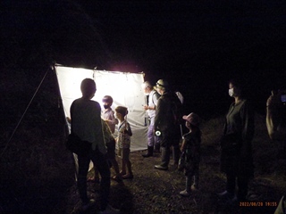 その後は、雨は止まり、灯火採集装置も無事で、その場で楽しく観察していたとき、また、ポツリポツリと来たので、そこで、即、終わりの挨拶で解散。しかし、また、雨が止まってくれたので、片づけは順調にできました。
