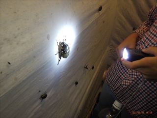 【左】仮眠中の蝶ちょ 【中】カブトムシがやって来た 【右】灯火に集まった虫を見る