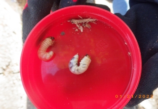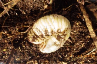 最後の観察地にて朽ち木と伐採された樹木のチップの腐葉土が集合をされた地を掘り起こし、観察したがクワガタムシの幼虫が10匹程とカブト虫の幼虫2匹が観察されたが例年より減少していて残念であった。