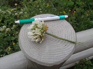 【左】雨の中、出発です 【右】異様に大きなシロツメクサの花がありました