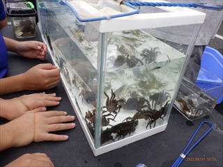 【左】お魚と触れ合う  【右】説明。手前…魚類、向こう…魚類以外の生きもの