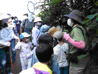 保育園児・小学校低学年児も多く参加し、それぞれ捕虫網、虫籠などを持ち捕獲した昆虫等について指導員に聞いていた。又、途中にてシモフリスズメの幼虫を採取しその大きさに目を輝かせ、変わるがわる手に乗せ重さを確認していた。