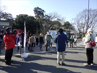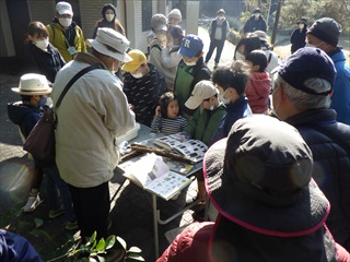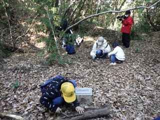 駐車場南端の受付場所で始めのお話後、池方面の散策路を行く。この方面には散策路の両側に草むらがあり、ここで、テントウムシやバッタの仲間を探して見つける作戦である。しかし、一昨日の下見の時と同様、一つも見つからず、早々に、物知りな子どもたちは朽ち木を割って冬越し中の虫を探し始めた。ここでは、朽ち木が目的ではないので、とりあえず、見つけた幼虫等を説明して、早めに切り上げた。