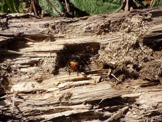 【左】朽ち木の中にコガタスズメバチ 【右】つかまえた虫さんの説明