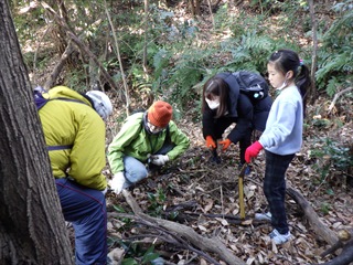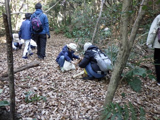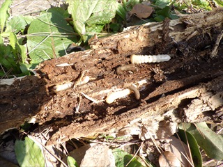 再び、駐車場に出て、そこを横切って、公園の林内に行く。もちろん、ここまでの途中で色んな説明場所はあったがそれは省略。林内では、ここでも、物知りの子どもたちは樹皮や葉裏に目もくれず、朽ち木割に精力を注ぐ。そして目的はクワガタの幼虫(成虫でも当然OK)。10年ほど前はそれらは多く出たが、毎年、狭い同じ場所でヤッてるので、近年は極めて少ない。 (記:榊原正)
