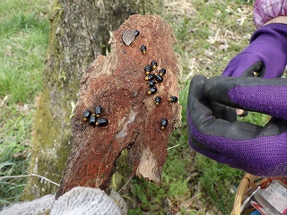 【左】クロウリハムシの集団越冬。めくれ掛けた樹皮の内側 【右】ツチイナゴ(成虫越冬)