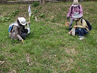 地面にはタンポポやキュウリ草の水色、オオイヌノフグリの青、カラスノエンドウの濃いピンク、自然の色を観察することができた。 (記 竹内秀)