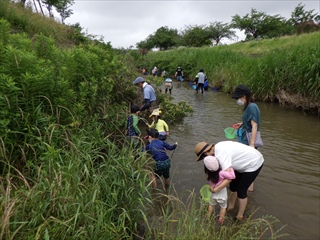 採取したものを水槽に入れ、種類ごとにどんな生き物なのか、詳しく説明をし、特に外来生物、特定外来生物について、なぜ日本に入ってきたのか、こんなに増えてしまったのかわかりやすく説明をした。  (小田明美:記)