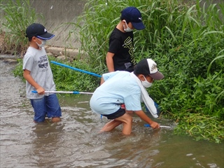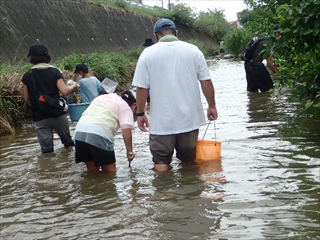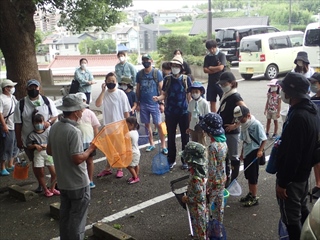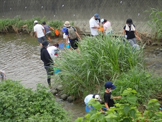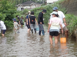 親子で参加した小さな子どもから大人まで川の中に入る。思ったより水温が低いと感じたようで、「つめたーい」という声が聞かれた。指導員から教わったとおり、足を使い、タモに生き物を追い込み採取していた。何度も参加しているようでタモや追い込み方が慣れて上手な親子もいた。7月中に大きな雨が2回降ったので生き物がいるか心配したが、夢中になって色々な生き物を採取でき1時間ほどの最終時間はあっという間に過ぎた。大きなギンブナが2匹もとれたが、水槽まで持っていくと弱りそうなのでタモの中で観察したりさわったりして逃がした。