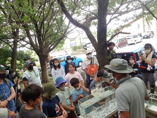 採取した生き物は指導員が用意した水槽に入れ、名前や特徴について、解説をした。知多半島で見られるものがおおむね捕らえることができていた。ナマズは須賀川での捕獲は初めてだと思われた。アメリカザリガニが1927年に20匹ほど食用ガエルの餌として持ち込まれたものが100年足らずの間に北海道と西表島以南をのぞくほとんどの場所に広がってしまったことや、ペットとして持ち込まれたミシシッピアカミミガメが、日本在来の生き物を脅かしているといった話もされた。