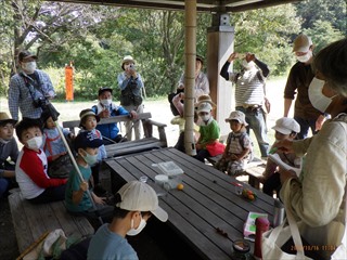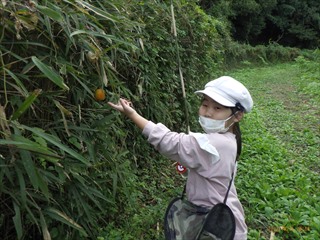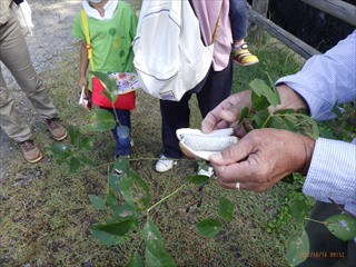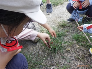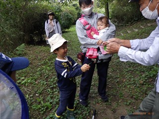 子供たちはカマキリやコオロギ、チョウ、バッタ類を手で捕まえたり、たもで 捕まえたりして楽しんだ。秋口のクワガタも見つけた。アケビは、大人たちが口にすると子供たちも「あま〜い」といいながら実りの秋の味を堪能していた。空中には蜘蛛のマンションができ、冬に備えて卵を準備するための食料調達にはげむ様子がうかがえた。