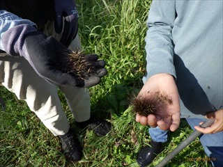 田んぼには稲穂がたれて実りを感じさせ、湿地帯にはセイタカアワダチソウの花やオギの群落が見られた。栗はイガばかりで収穫には少し遅かったよう。道に生えるオオバコの花の軸ですもうが始まると、「あと何人勝てるか」と子供たちの歓声が森に響いた。 (記・竹内秀)