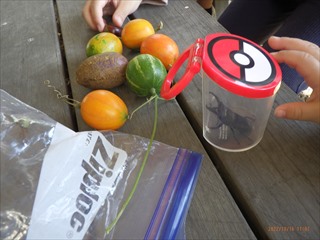【左】あちこちに低い位置にカラスウリ 【右】本日採集したもの見たものを確認(まとめ)