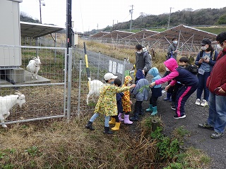 【左】大きなかたまりの(卵塊)の一部 【右】ヤギさんと遊ぶ。ヤギさんが好む草を配っている場面