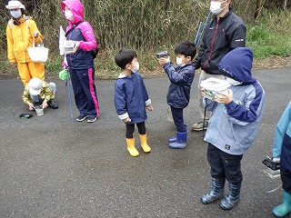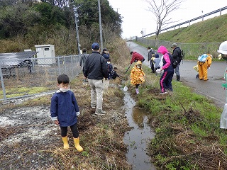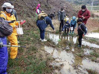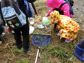 【左】ここでも生きもの探し  【中】小さなオタマジャクシがいっぱい  【右】終わりの挨拶とお話