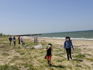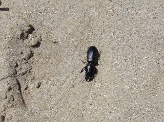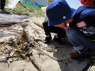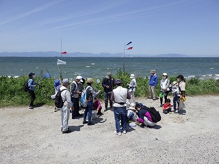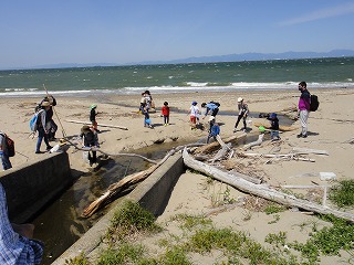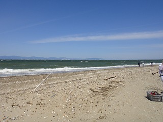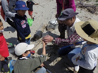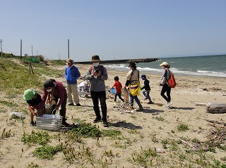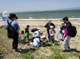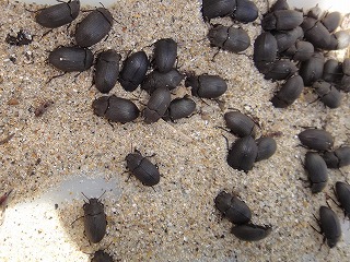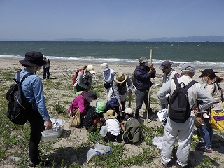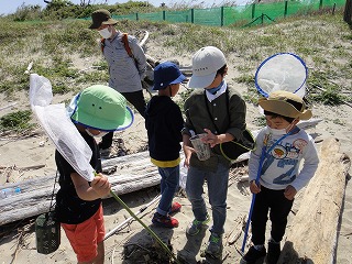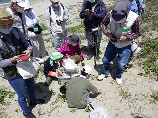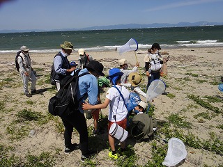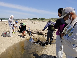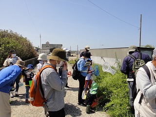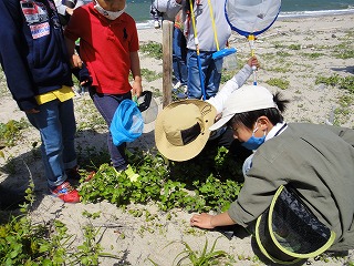 5月7日(土)午前中に下見を実施した。現地の安全、開花期を迎えた海浜植物、訪花している昆虫たちを確認しつつ、夜行性甲虫の捕獲を狙ったトラップ(落とし穴コップと餌となる煮干)を8ヶ所ほど仕掛けた。5月8日(日)本番日は快晴にはなったが風がやや強く飛翔する昆虫の観察は難しい状況になった。知多観ネットの他に「広報とこなめ」でも開催案内をしており、常連の蟲友を含めて14名の一般参加があった。用意したラミネート図鑑(花編・蟲編)は家族に1部ずつプレゼントし予備知識として頂いた。観察は砂浜沿いに1Km程を散策しながら、開花している花を中心に話題や解説を伝えた。蟲トラップ付近には黄色くペイントした目印を立て子どもたちでも探せるようにした事もあり、皆が夢中になって場所探しをしていた。トラップには植物食のヒメスナゴミムシダマシが大量に捕獲されていた。ハサミムシ、ダンゴムシ、ワラジムシ、クモも目立った。中でも全員が注目したのは珍しい動物食の「オオヒョウタンゴミムシ」で大人たちも写真撮影に夢中になった。周囲には餌食となったスナゴミムシダマシが累々と転がっていた。本種について愛知県では庄内川河岸、常滑沿岸などでの報告実績があるが数少ない。なお、類似の「ホソヒョウタンゴミムシ」は旭公園、大同グランド、佐布里公園等での報告がある。その他目的外観察にはなるが、海へ流れ出る排水溝で沢山の小魚群を見つけ、これも皆が夢中になって魚捕り出来た事も感動の一部である。まだまだ書き足りないが、予期せぬ驚きや感動に溢れた観察会になった事を報告しておく。(記・森田)