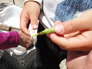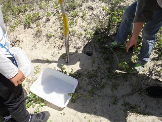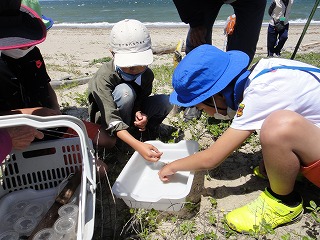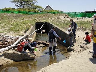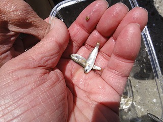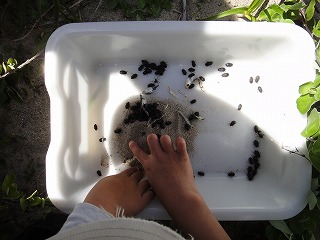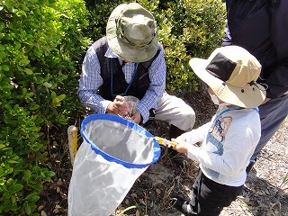 【左】スナゴミムシダマシ大量捕獲、皆で触れば怖くない      【右】予定外の小魚捕り