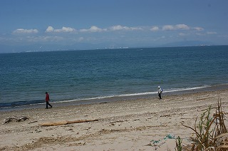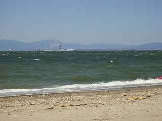 【左】西ノ口海岸方面(下見)   【中】波打ち際   【右】御在所の山々