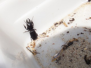 【左】虫捕りトラップと目印しの棒   【中】大物がいた   【右】小さなコメツキムシの仲間もいた