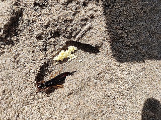 【左】流木の下のハマベハサミムシ 抱卵中   【中】オオヒョウタンゴミムシと餌食になったヒメスナゴミムシダマシ残骸   【右】オオヒョウタンゴミムシ