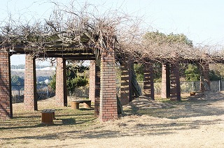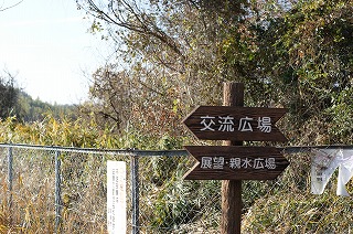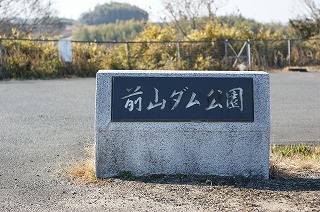 【左】前山ダム公園礎石   【中】池周辺案内板、ダム地図   【右】交流広場、展望・親水広場案内