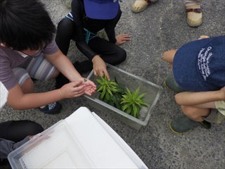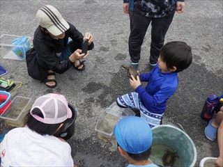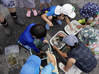 【左・中】ふれあいコーナー(ふれあいタイム)。好きな子は終わらない… 【右】放流