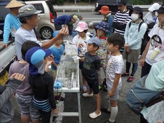 【左】魚が多く見栄えした水族館 【右】捕らえた生きものの説明。子どもは前列