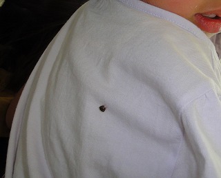 【左】肩に留まったマルカメムシ   【中】イスノキに居た未同定種 幼虫   【右】同左 拡大