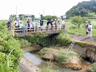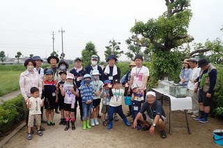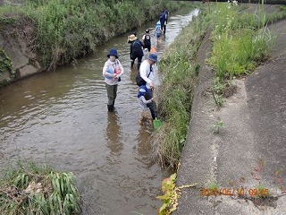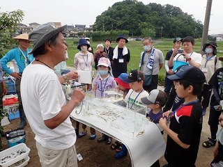 【左】川を見ながら観察説明と魚等の捕らえ方を説明 【右】川の中でガサガサ 【左】捕らえた生き物たちを説明しています 【右】参加者一同の写真