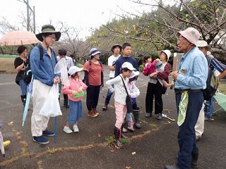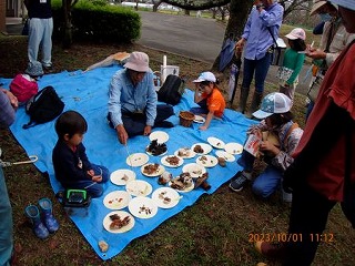 いる、菌糸体で菌類に属し、動植物等を分解する物体で地球上ではなくては成らない大切な謎の多い生物であることを説明された。キノコを理解して、興味をわかせて観察に出かける。結果は昨年より多くのキノコに出会えた。参加された家族の方々はキノコだけで無く、チョウやトンボ、樹木等の自然に触れて、感触を体験し、最後に皆で採取したキノコの名前や特徴等の説明があり、有意義な観察会であった。