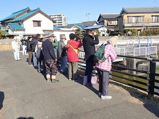 古川さんが鳥の声を聞くだけで鳥の名前が分かるので、参加者全員がビックリしていた。その後背戸之池に戻るとカモが集まっていた。古川さんのセットした望遠鏡で覗いたりして、大人も小さな子まで楽しく観察することができた。(記:吉房)