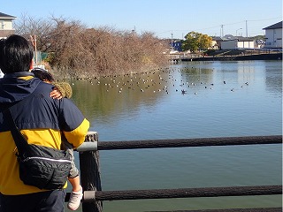 観察会日和の快晴。寒くても風がなく、馬池では多数のカモなどが水面に浮かんでいた。靜かにそっと近づいたのに、群れのまま靜かにゆっくりと奥へと離れていく姿に思わず笑ってしまった。幼い子供ですら「カモがいつの間にか少しずつ向こうに行くね」と驚いていた。古川さんが「カモは夜の間に餌を探して食べ、今のんびりと昼寝をしていたのに、皆の足音や声で目を覚まし、少しずつ離れだしたんだよ」と話すと子供達は感心していた。
