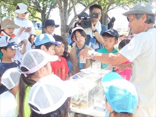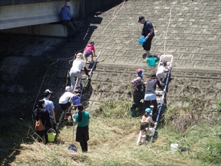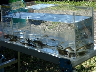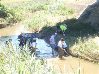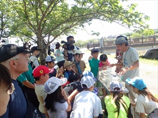 人が多いというのはすごいもので、1時間と少しの時間でたくさんの生き物が採集で きた。最後に採取したものを水槽に入れ、種類ごとにどんな生き物なのか、詳しく説 明をし、特に外来生物、特定外来生物について、なぜ日本に入ってきたのか、こんな に増えてしまったのか説明を聞いた。小さく細いものに混ざって直径3センチほどの ウナギがとれ、ウナギが遠くから日本にやってくるという話を聞くと子供たちから食 べるのか逃がすのかどうしたらよいか考えが飛び交った。