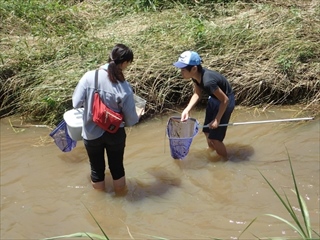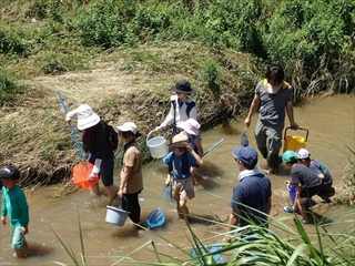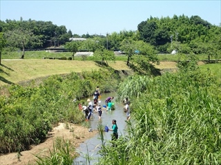 参加者は環境課を通しての参加者と、豊田自動織機関係の参加者で、大人の多い会 となった。前日も雨が降らなかったせいもあってか水は思ったより少なくかいどりに はちょうどよい深さ。田んぼの作業が進んでいるせいか少し濁っているなと感じなか ら水に入った。水の上を渡る風は涼しく、水はほどよく冷たく、一足先にプールに 入った気分で水に浮かんでいる子もいた。ハグロトンボがひらひらと空を舞い、暑い けれど気持ちのよい川遊びとなった。