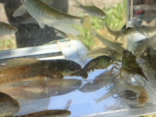 フナ、コイ、ボラの子供、オイカワ、マハゼ、ウナギ、ウキゴリ(浮いているハゼ)、モツゴ(クチボソ)、ヨシノボリ、ブルーギル、ブラックバス、カダヤシ、モクズガニ、ドブガイの貝殻、マシジミ、アマガエル、ヌマガエル、ウシガエルのオタマジャクシ、ハグロトンボのヤゴ、コオイムシ、アメンボ(甘い匂いがする)、ヌマエビ、スジエビ、アメリカザリガニ、